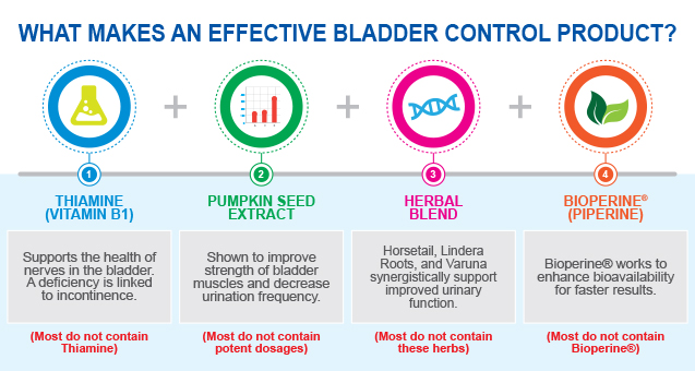 A good urinary incontinence supplement should address weakened pelvic floor muscles, hormonal changes, and nerve damage. To do this, it needs to contain clinically-studied ingredients such as an effective daily serving of Thiamine (Vitamin B1) to replenish and prevent a deficiency linked to neurogenic incontinence. It should also contain ingredients such as Pumpkin Seed and Soy Isoflavones to help strengthen the muscles in the bladder and target hormonal influences on bladder leakage. For optimal efficacy, there should also be an herbal blend with Varuna (crataeva nurvala), Lindera Root (Lindera aggregata), and Horsetail (Equisetum arvense) for bolstering bladder health to improve urinary flow and reduce feelings of urgency. Ideally, it should also contain BioPerine® or an equivalent thermogenic enhancer to ensure optimal absorption and fast-acting results. There is no need for any additional unnecessary ingredients, binders, fillers, additives, or preservatives.