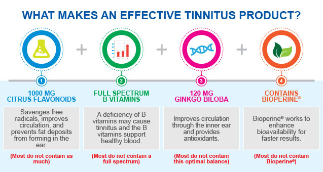 A good tinnitus supplement should contain a significant and potent daily serving of flavonoid antioxidants for scavenging free radicals that could be causing inflammation or irritation in the inner ear. It should also provide B vitamins, Ginkgo Biloba, and Magnesium, for improving blood flow through the ear. There is also value to having a bioavailability enhancer, such as Piperine, in the formula to improve nutrient absorption.