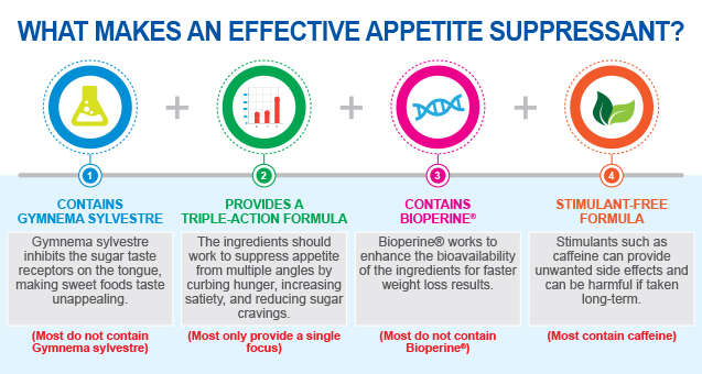 A good appetite suppressant should manage appetite from multiple angles. It should contain ingredients which not only curb hunger, but also increase feelings of fullness to avoid overeating and reduce sugar cravings which is one of the biggest hurdles most people face when it comes to avoid binge eating and following a healthy diet. The formula should not contain any stimulants and there is no need for any additional unnecessary ingredients, binders, fillers, additives or preservatives. Adding BioPerine® to the formula (or a similar) equivalent will ensure optimal absorption and fast acting results.
